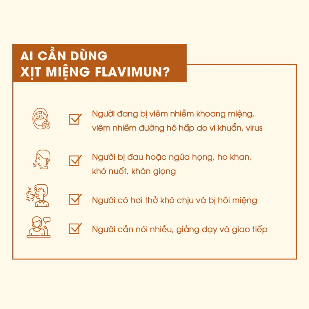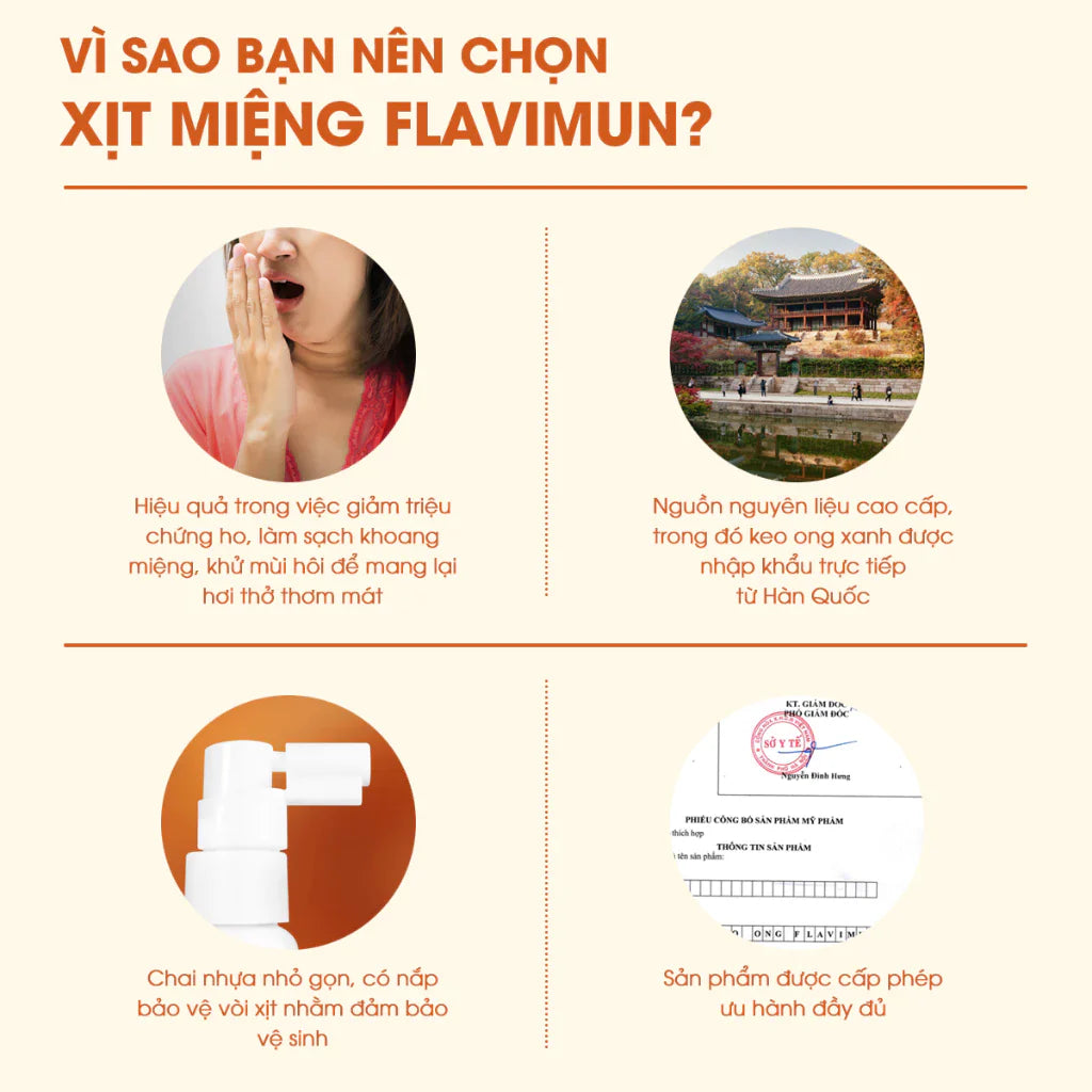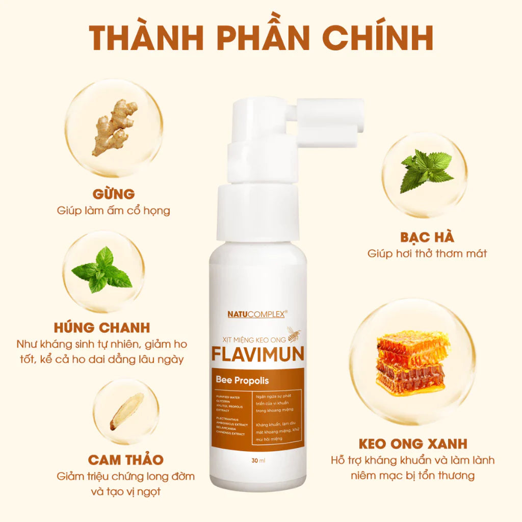 Xịt họng keo ong Flavimun được chiết xuất từ keo ong xanh Brazil và kết hợp thêm với các loại dược liệu khác như húng chanh, rẻ quạt, gừng, cam thảo, bạc hà và xử lý bởi công nghệ độc quyền WEEP của Hàn Quốc. Sản phẩm được sản xuất tại nhà máy đạt chuẩn GMP do Bộ Y tế công nhận, giúp bảo vệ cổ họng khỏi viêm, đau rát, ho khan và mang lại hơi thở thơm mát. Đảm bảo an toàn, hiệu quả tốt nhất cho sức khỏe người dùng.